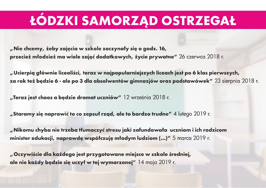 Po nauczycielach, z których wielu straciło pracę, uczniowie są kolejnymi ofiarami bezmyślnej reformy rządu PiS. W Łodzi, dzięki staraniom samorządowców, udało się zminimalizować negatywne konsekwencje reformy, mimo to 460 uczniów nie dostało się do żadnej szkoły średniej, a tym którzy się dostali, grozi pogorszenie warunków nauczania, głównie z powodu tłoku w szkołach.